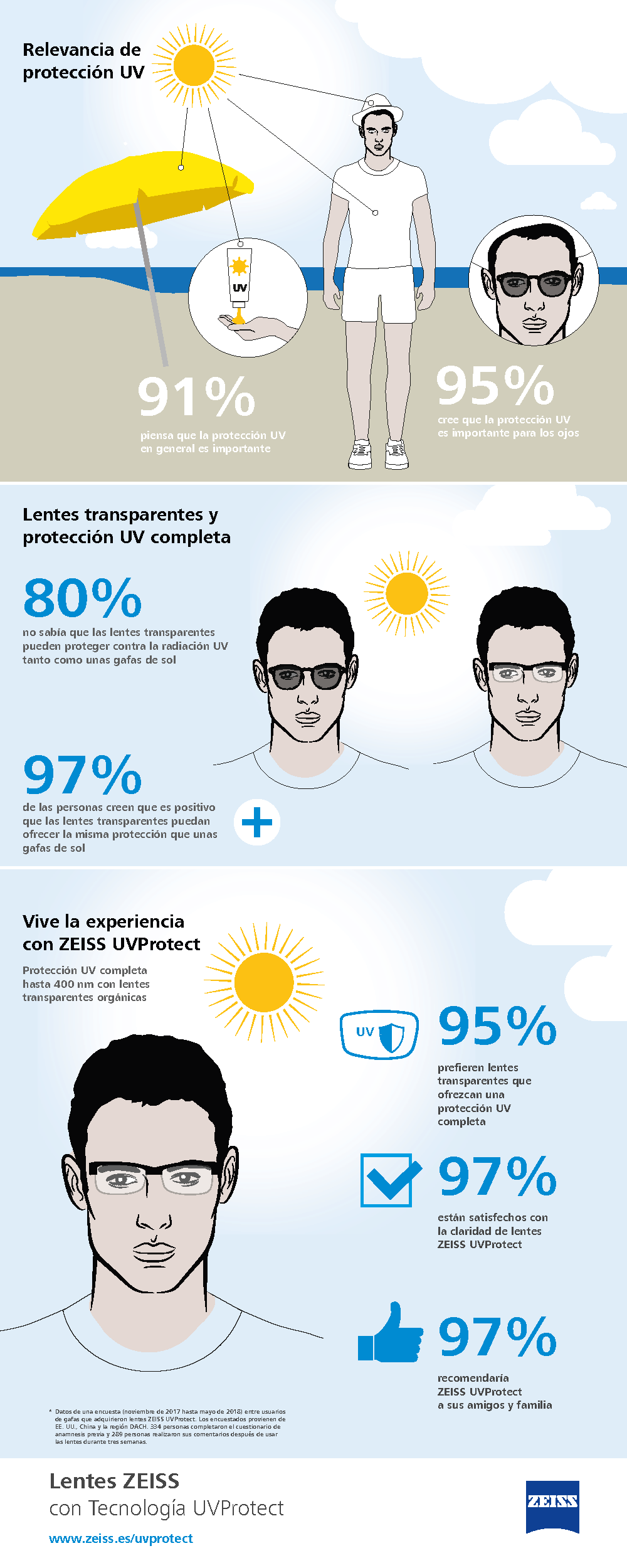 El estudio: entre noviembre de 2017 y mayo de 2018, ZEISS llevó a cabo un estudio entre usuarios de gafas que adquirieron lentes ZEISS UVProtect. Se les pidió que completasen un cuestionario en los centros colaboradores y, después, de nuevo en línea tras haber usado las lentes con tecnología UVProtect durante tres semanas. Los participantes eran originarios de Estados Unidos (anamnesis n = 56, informe final n = 50), China (anamnesis e informe final n = 100) y Alemania, Austria y Suiza (anamnesis n = 178, informe final n = 139). El cuestionario versaba sobre la protección UV y su satisfacción con las lentes. 334 personas completaron el cuestionario de anamnesis y 289 personas completaron un informe final después de llevar las lentes durante tres semanas.